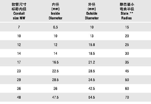型號(hào) 軟管尺寸標(biāo)稱(chēng)內(nèi)徑 內(nèi)徑 外徑 靜態(tài)最小彎曲半徑